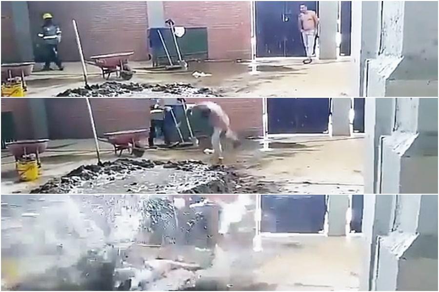 En las imágenes se ve cómo el obrero se lanza mediante una maniobra acrobática sobre lo que sería una mezcla de agua y cemento. Allí se alcanza a observar a otro trabajador que va pasando por la parte baja interna de una de las graderías, además de la presencia de quien sostiene el dispositivo fílmico.