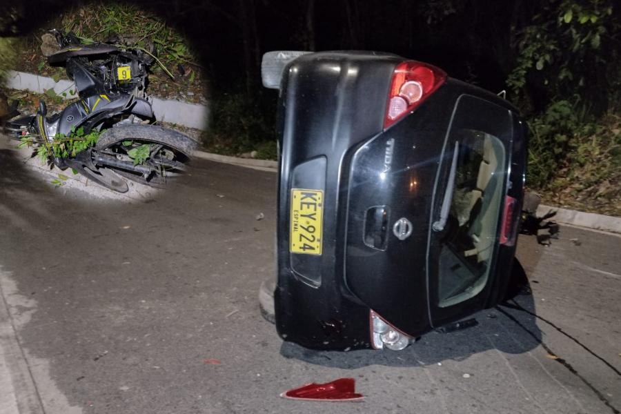 El delicado accidente de tránsito ocurrió sobre la una de la mañana de este lunes festivo a la altura del kilómetro 01 de la vía que conduce hacia el cañón del Combeima, donde las autoridades de tránsito tuvieron que atender la violenta colisión entre un automóvil y los ocupantes de una motocicleta.